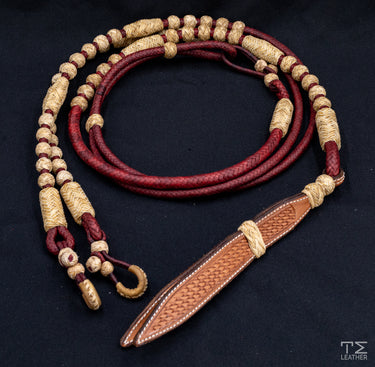 12 Plait, 104" Maroon Kangaroo Leather Romel Reins with Natural Rawhide and a Leather Popper