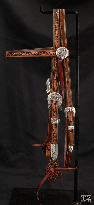 Brown and Light Brown Floral Carved Browband Headstall