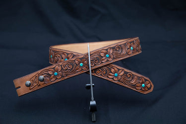 Light Brown and Black Teal Daisy Floral Carved Belt with Teal Accents. Sizes 28-42. Style #360.
