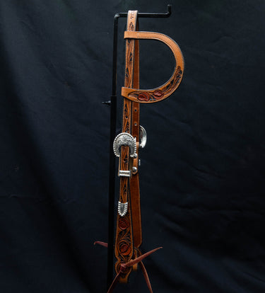 Light Brown and Black Floral Carved Slide Ear Headstall with Saddle Tan Leaves
