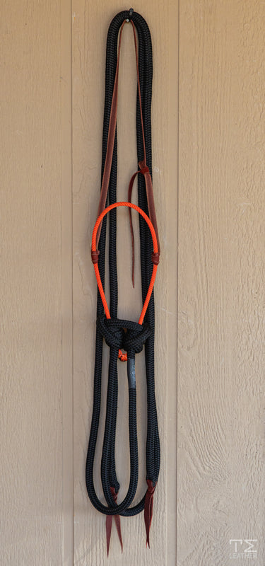 Loping hackamore neon orange noseband with 8' black split reins.