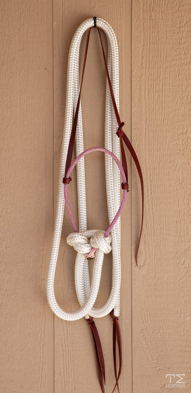 Loping hackamore Fuchsia noseband with white split reins.