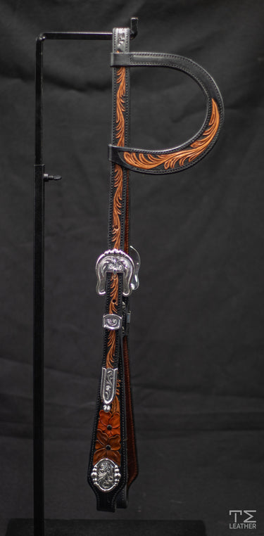 Black and Light Brown Two Toned Floral Carved with Saddle Tan and Brown Accents Slide Ear Headstall.