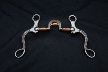 This beautifully crafted bit features a brown Sheridan shank with silver engraved plates and dots. The mouthpiece is an Equalizer with a copper roller. This shank measures 8".