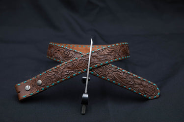 Walnut and Teal Buck-Stitched Teal Mesa Floral Carved Belt. Sizes 28-42. Style #320.