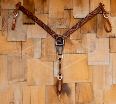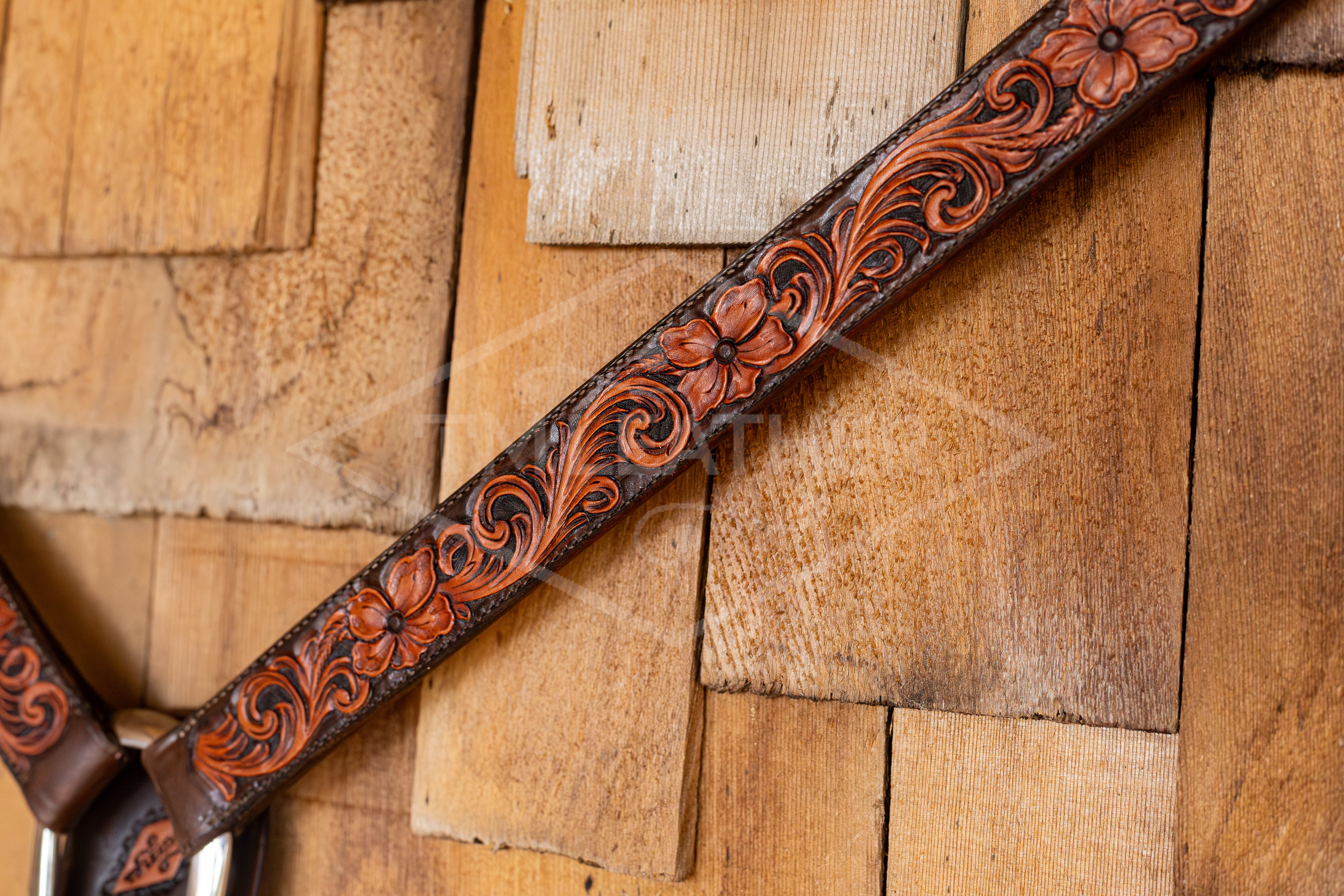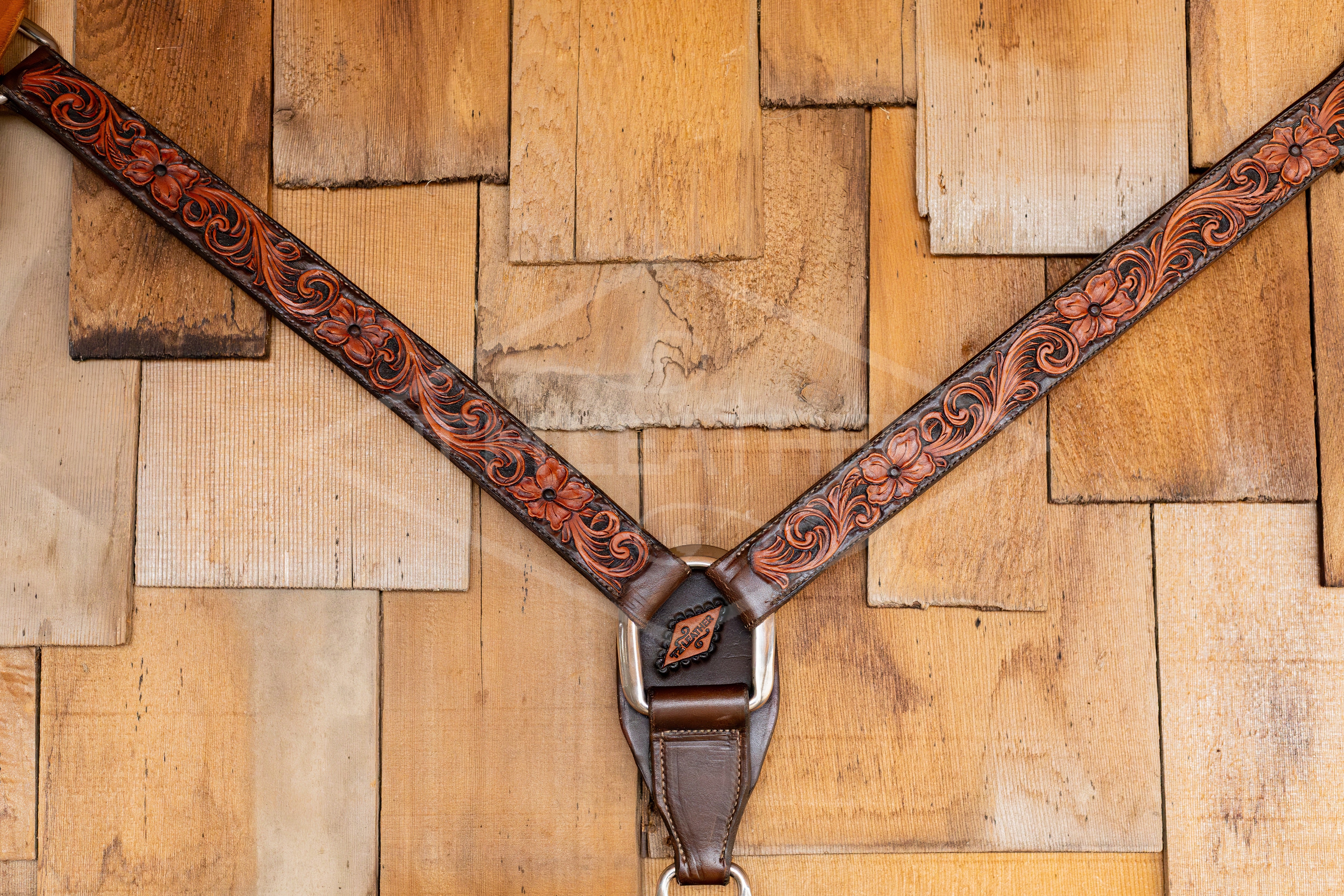 1” Breast Collar Walnut, Black, and Natural Tri-Toned Floral Carved with Silver Hardware