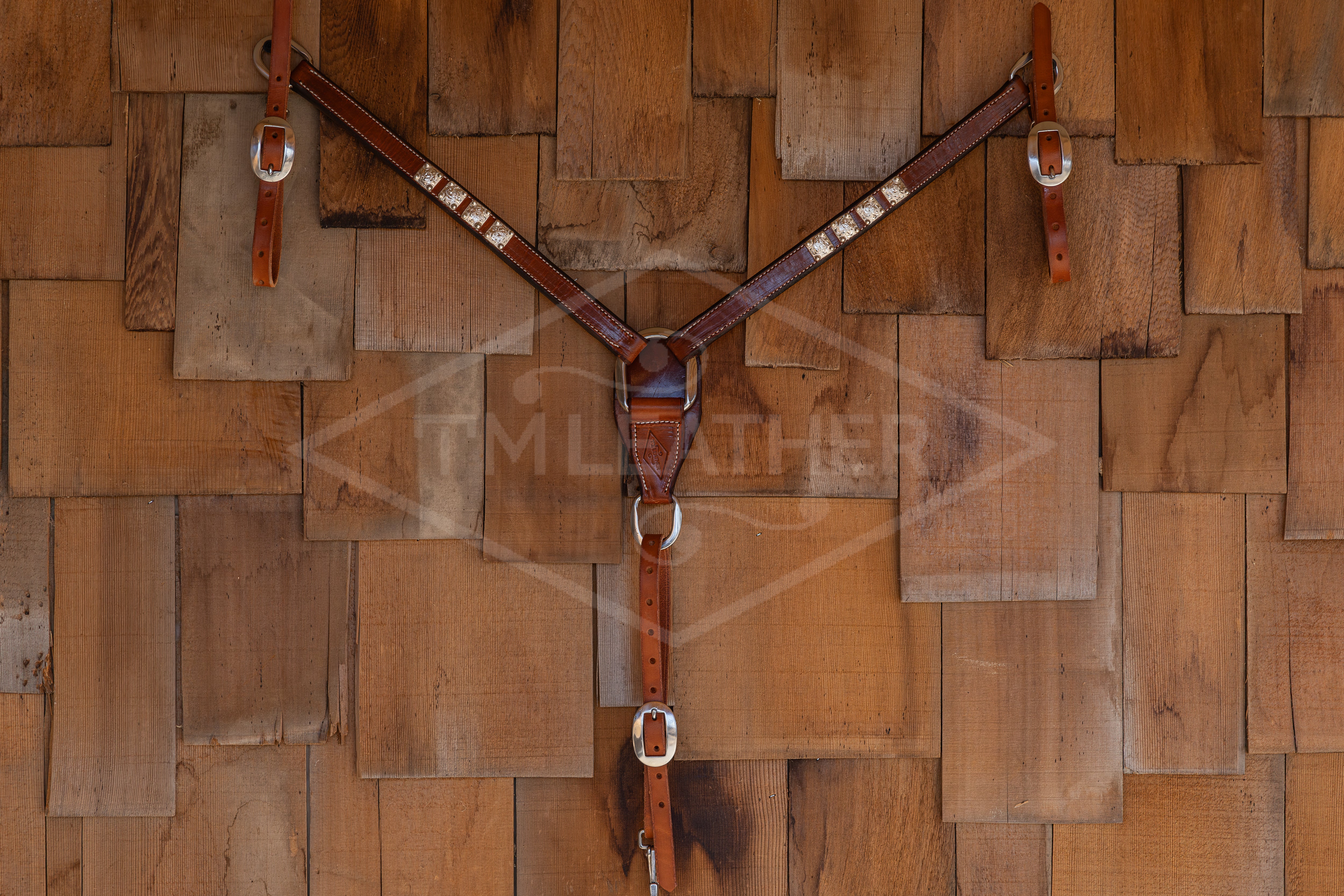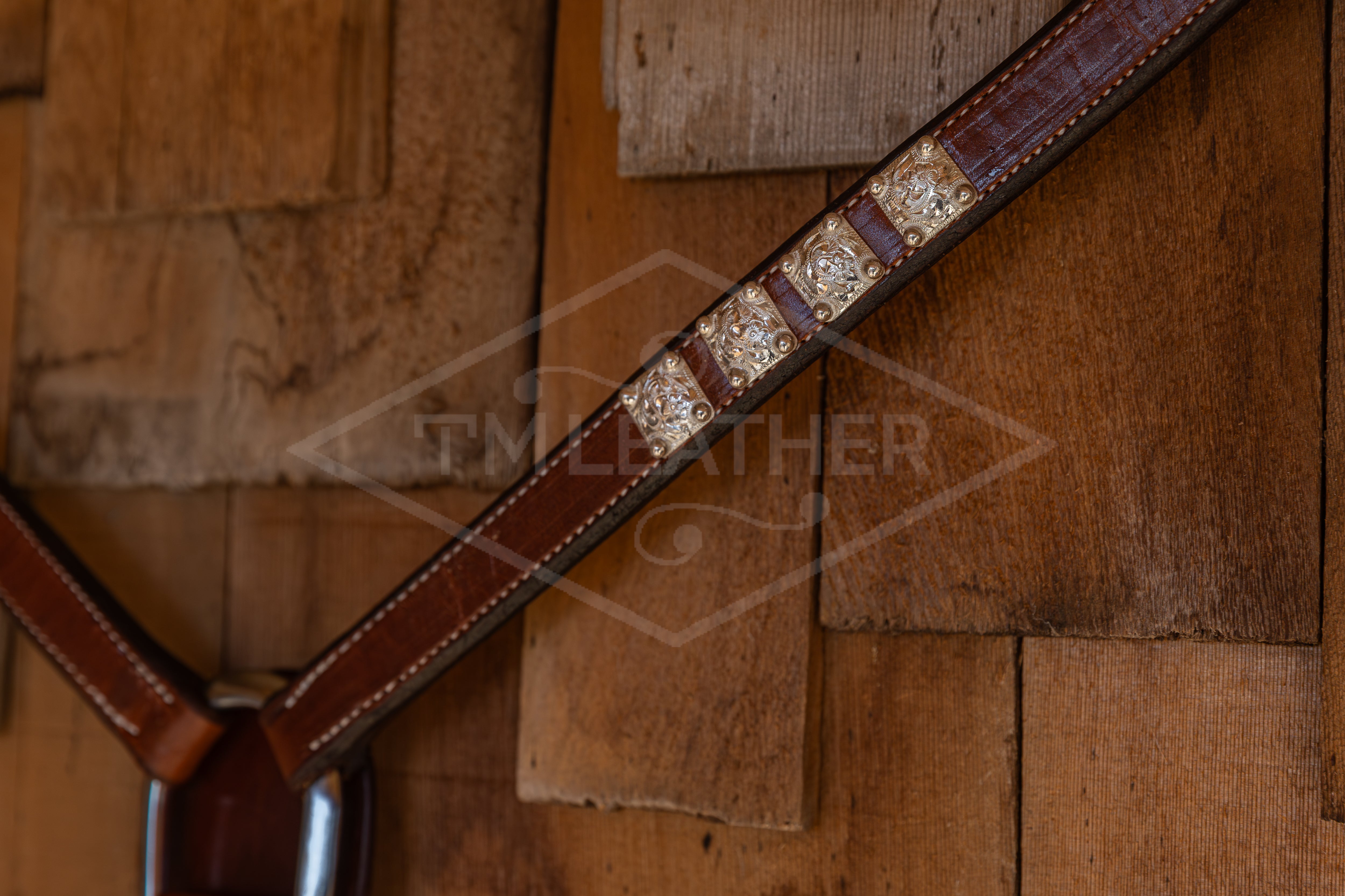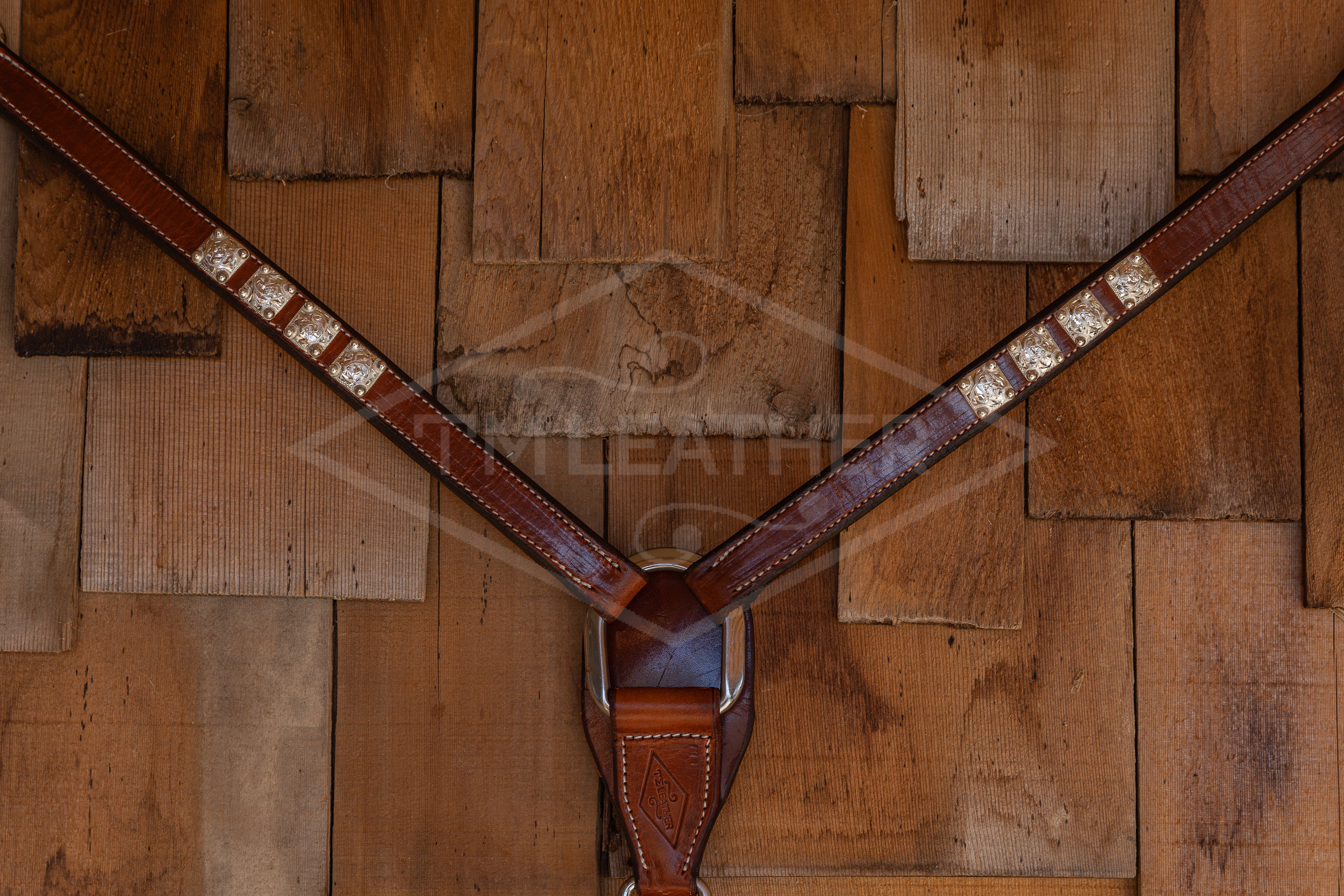 Features 4 Small Engraved Silver Plated Square Conchos with Beaded Corner Accents