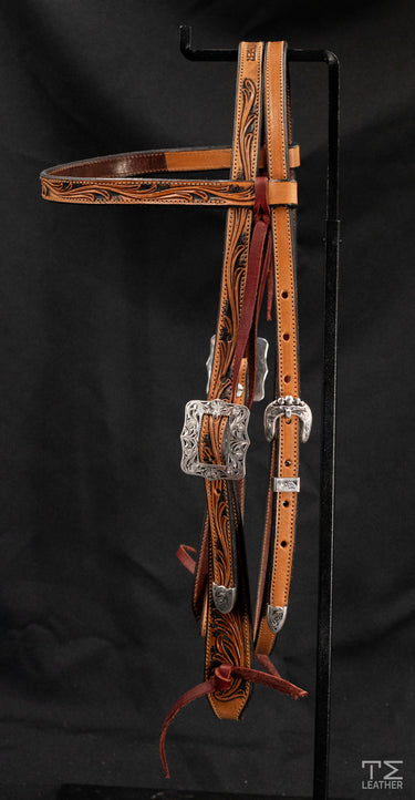 Light Saddle Tan and Black Floral Carved Browband Headstall