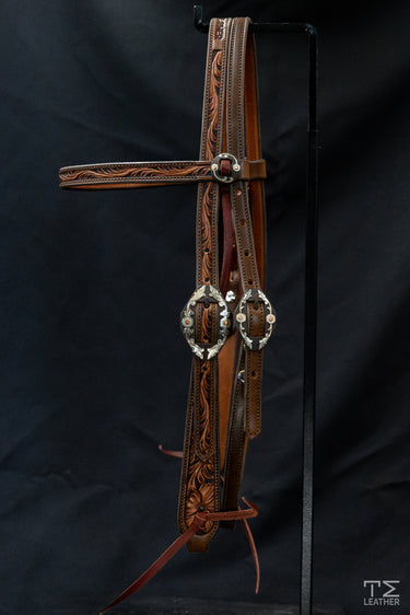 Chocolate and Light Brown Floral Carved Browband Headstall. String Tied.
