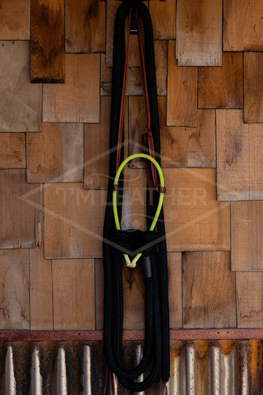 Loping hackamore neon yellow noseband with 8' black split reins.
