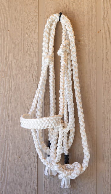 Flat noseband mule tape halter, with 9' lead rope. Fits average sized quarter horses.