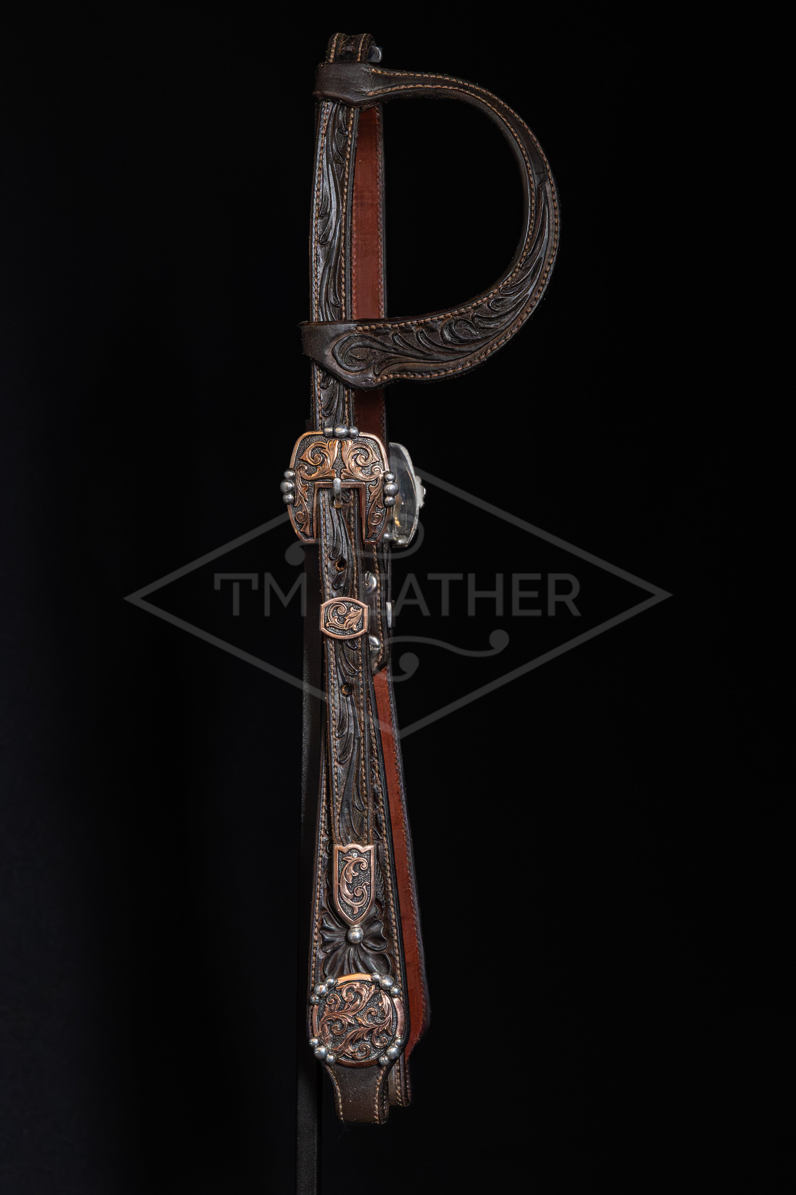Slide Ear Chocolate Floral w/ Copper Overlay Hardware w/ Silver Graduating Beads & Round Conchos