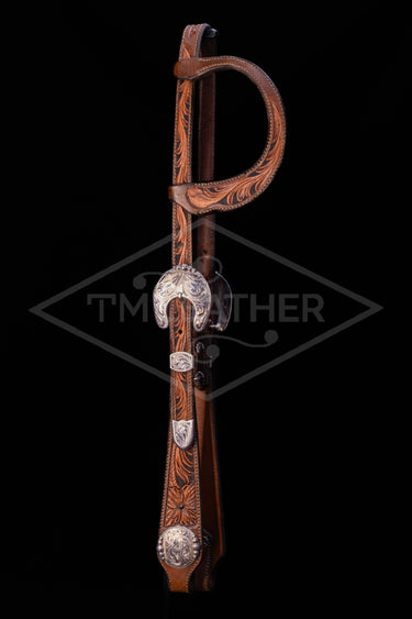 Slide Ear Black, Walnut, & Natural Two Toned Floral w/ Engraved Silver Plated Buckles & Matching Round Conchos w/ Graduating Beads