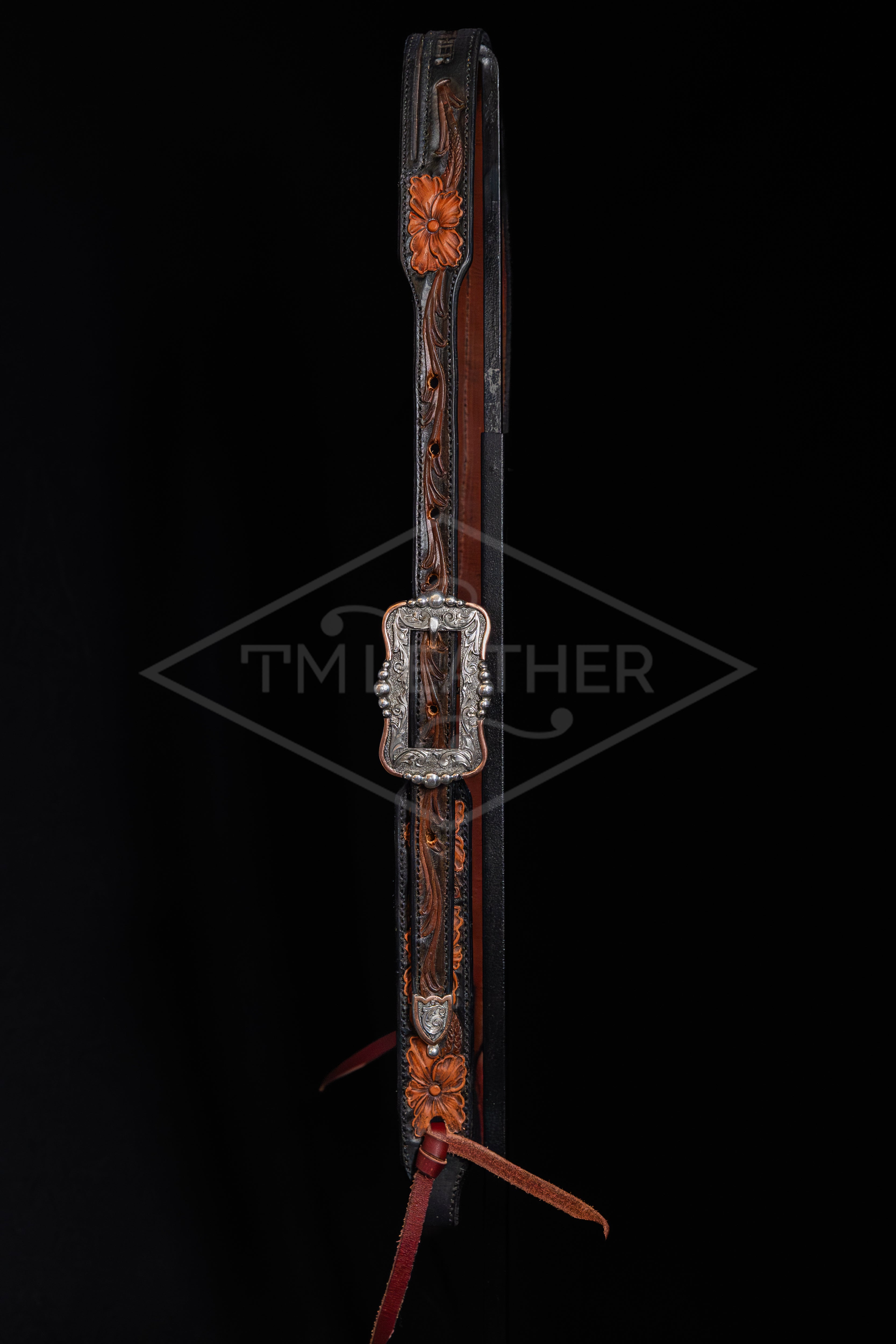 Slit Ear Black, Natural & Walnut Floral Headstall w/ Silver Overlay Hardware w/ Copper Borders & Graduating Beads