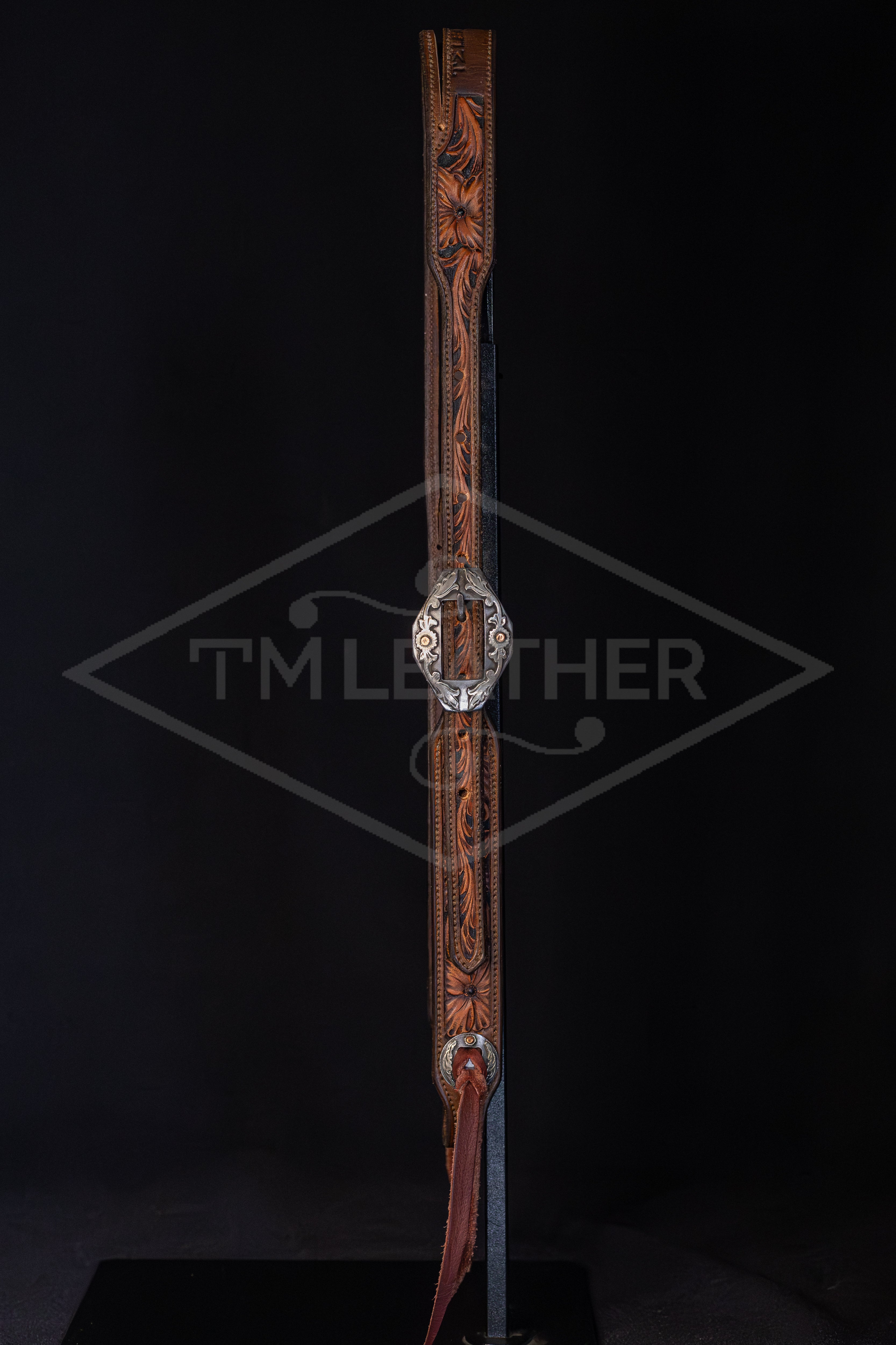 Slit Ear Walnut, Black, & Natural Floral Headstall w/ Silver Diamond Floral Buckles & Matching Conchos
