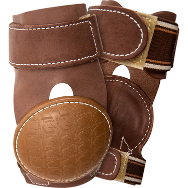Protects the performance horse from injuries caused by sliding stop maneuvers. Extensively tested for durability, comfort and fit. Provides complete fetlock protection and no-rub fit. Outer shell is made from a full grain American cowhide specially treated to remain soft and pliable. Skid cup shaped and positioned to make contact with the ground in the center of the cup and proven to withstand the coarsest ground conditions. Two easy on-off double closures secure the boot close to the horses fetlock.