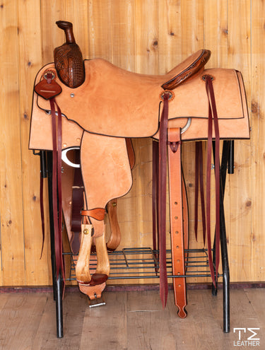 16" Ranch Cutter Natural Roughout with 1/4 Floral and Waffle Carved Two-Toned Saddle
