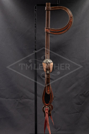 Features TM Leather Exclusive Browned Tapered Oval Shaped Buckles with Floral and Copper Overlay and Matching Slotted Conchos