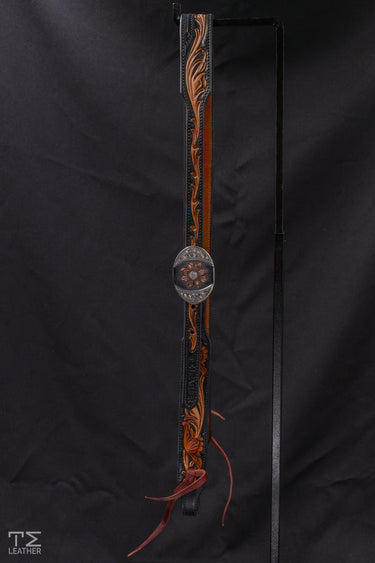 Black and Saddle Tan Two-Toned Floral Carved Slit Ear Headstall with Walnut Accents