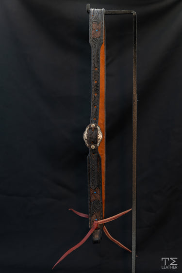 Features Browned Oval Shaped Buckle with Silver and Copper Floral Overlay