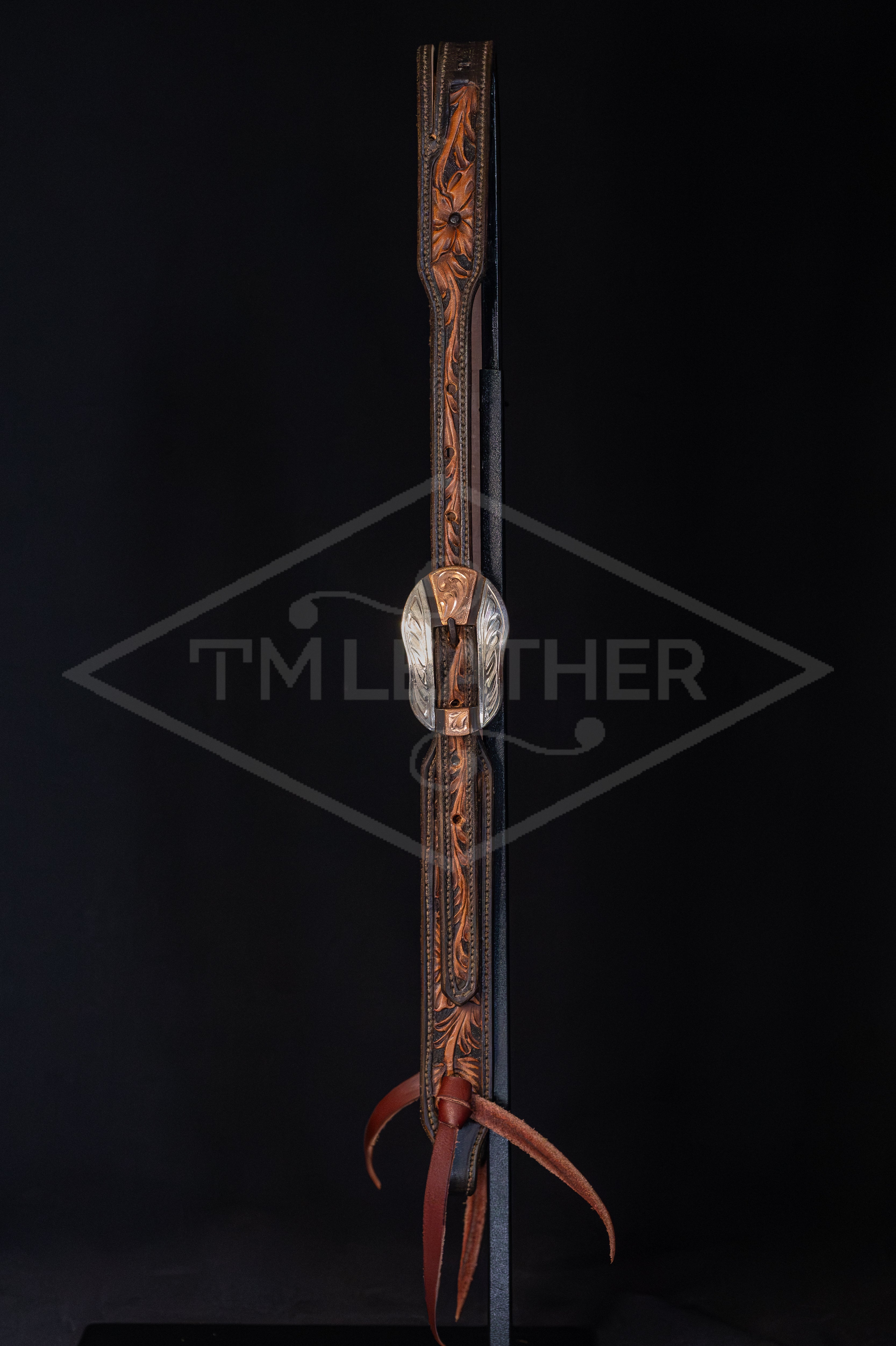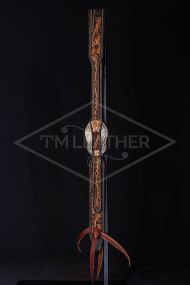 Features Browned Silverton Oblong Buckle with Floral and Copper Scrolled Overlay