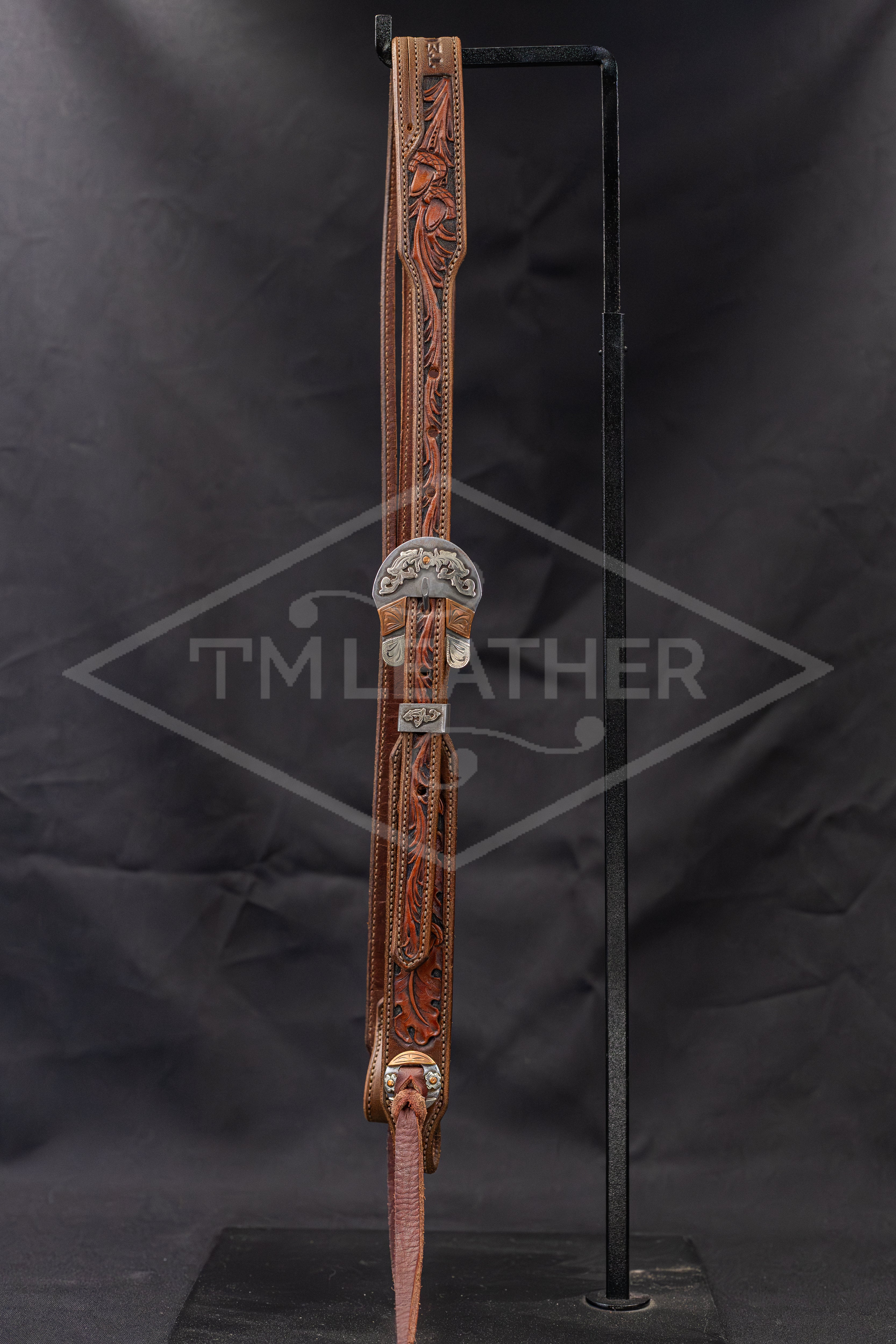 Features Silver Buckle with Floral and Scrollwork Overlay with Copper Accents and Matching Conchos