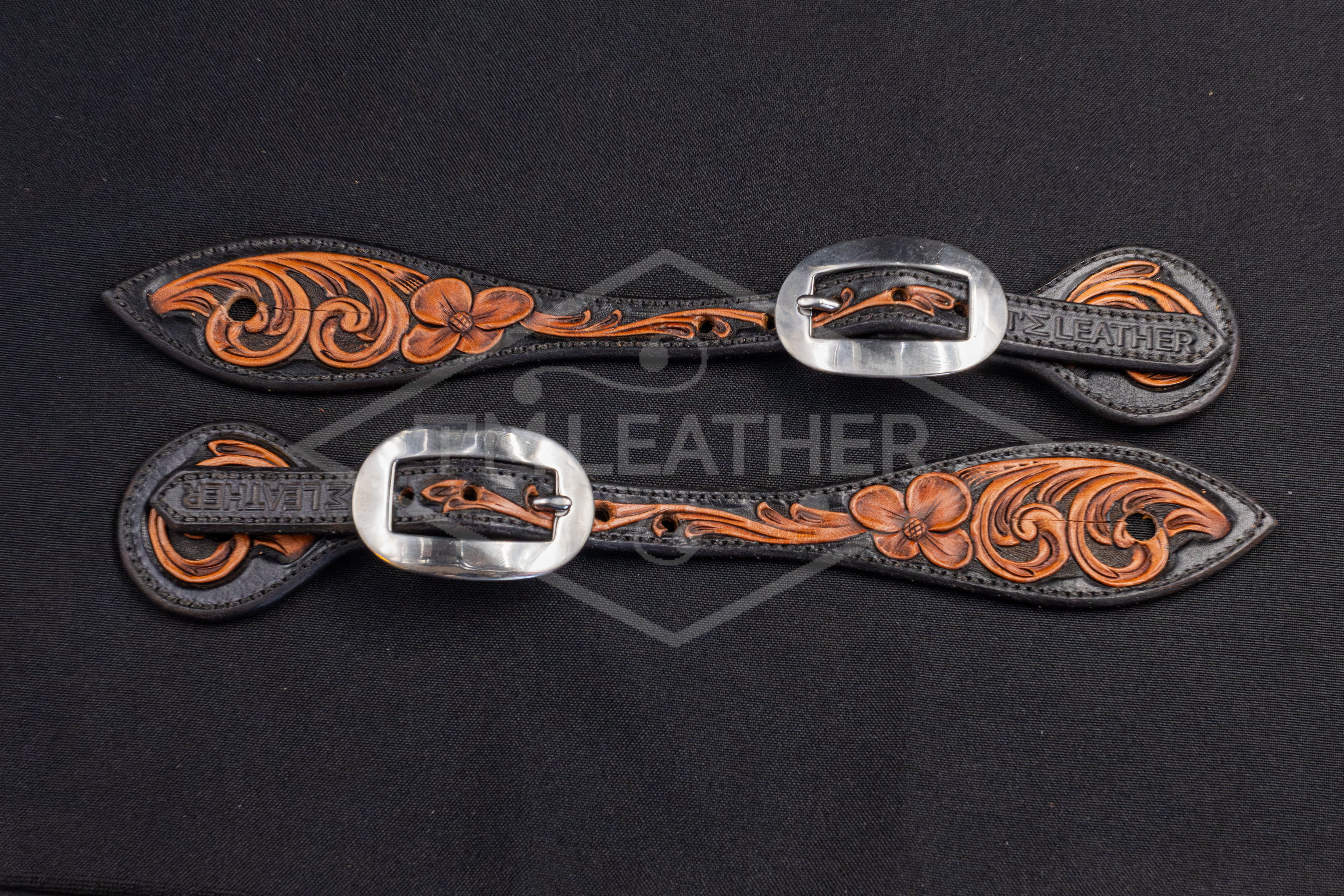 Black & Natural Small Floral Spur Straps w/ Plain Buckles